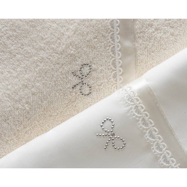 Simple and elegant cotton towel set in ivory color with delicate lurex lace, satin ribbon and rhinestone bow design